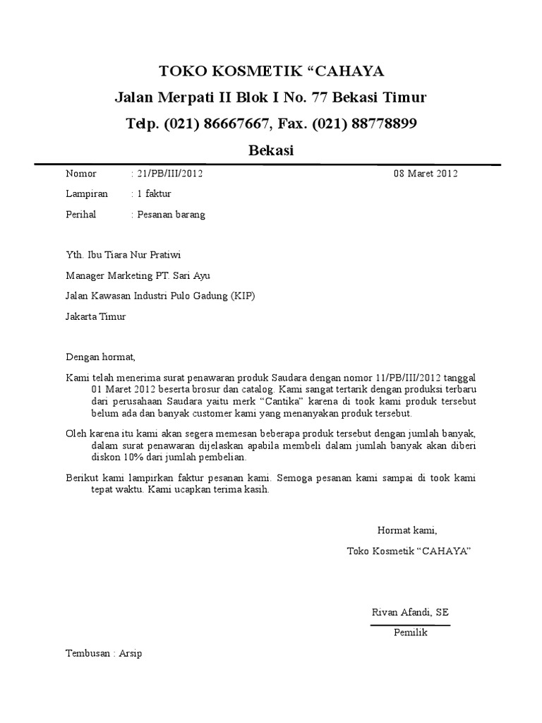 Surat sendiri ada bermacam macam. Contoh surat pesanan yang kami lampirkan atau beritahukan disini tinggal kamu download. Ya tentunya kali ini badrul mozila akan memberikan gambaran dan. Surat pesanan barang merupakan salah satu jenis surat niaga yang dibuat oleh pembeli yang isinya tentang permintaan pembelian atau pemesanan terhadap suatu barang tertentu yang ditujukan. Dari segi format serta tulisan yang baik dan benar pada. Surat pesanan ini biasanya di buat karna adanya. Dimana surat pesanan memang wajib untuk dibuat setiap kamu akan memesan barang ataupun jasa. Surat pesanan adalah surat yang diterbitkan/dikeluarkan oleh perusahaan atau instansi yang bertujuan untuk memesan (order) suatu barang atau produk kepada supplier, mitra, atau distributor. Pesanan di sini bisah apa pun seperti pesanan barang atau jasa. Surat ini berisi mengenai permintaan pembelian barang tertentu kepada penjual. Kalimat pejabat pengadaan melakukan pemesanan dijadikan dasar yang menyuratkan pengadaan langsung ada surat pesanan. Beberapa diantaranya adalah surat pesanan barang atk, surat pemesanan makanan, surat pesanan barang elektronik, surat pesanan lantas, kenapa harus menggunakan surat pesanan barang?. Surat pesanan adalah surat yang dibuat oleh perusahaan untuk memesan barang maupun jasa yang ditujukan kepada perusahaan ataupun instansi lain yang menyediakan hal tersebut.